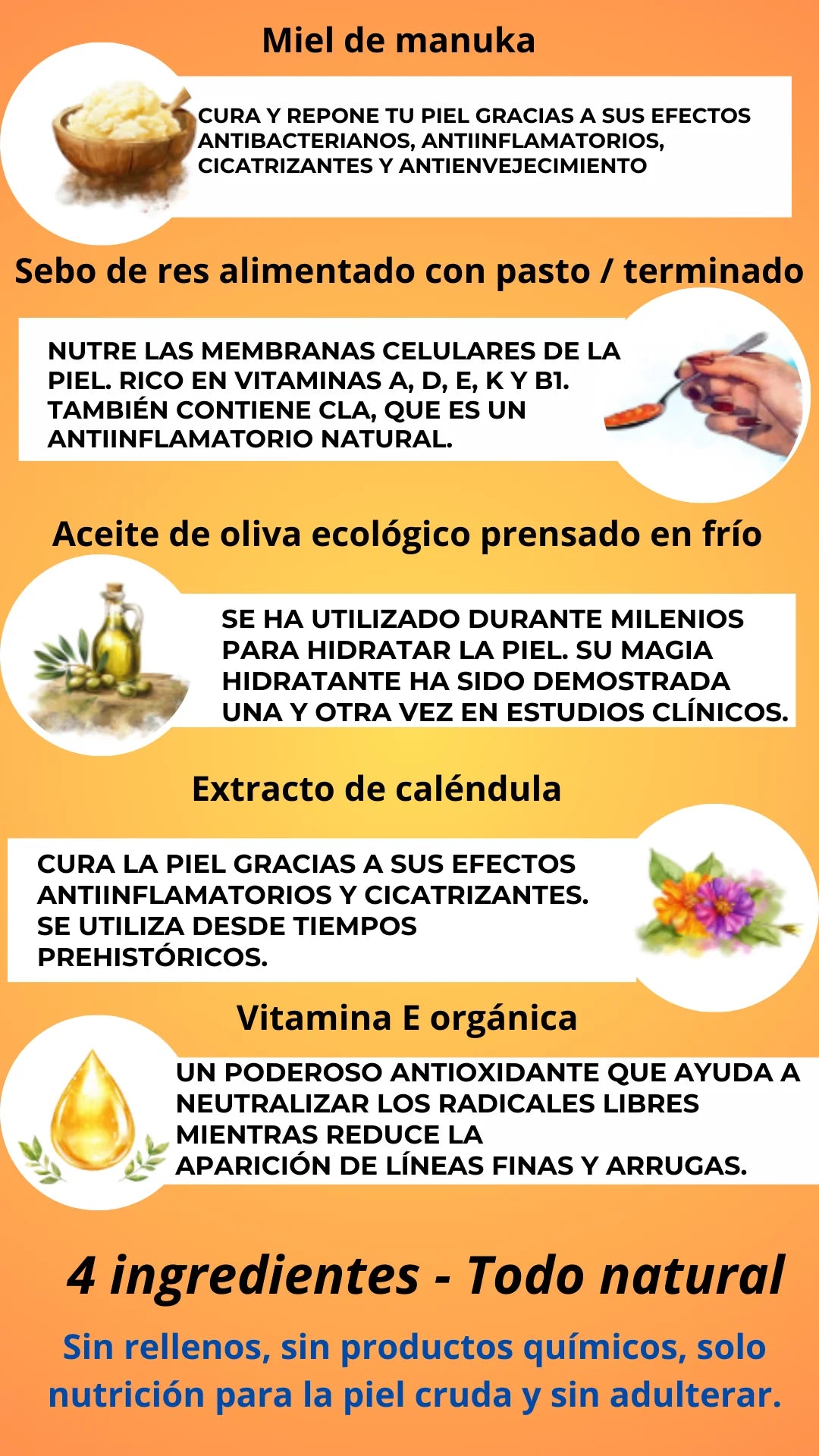Es un bálsamo o crema natural elaborado con sebo de res, miel de Manuka, aceite de oliva prensado en frío, extracto de caléndula, vitamina E, etc.
